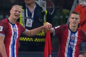 双子星📸挪威11-1狂胜,哈兰德与厄德高一起扶角旗竿庆祝