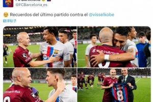 北京时间今天晚上,巴萨将在友谊赛中对阵神户胜利船,巴萨官方社媒晒出2023年两队在友谊赛中交手的照片,当时巴萨名宿伊涅斯塔效力于神户胜利船,他与多位巴萨球员拥抱寒暄,并获赠球衣。